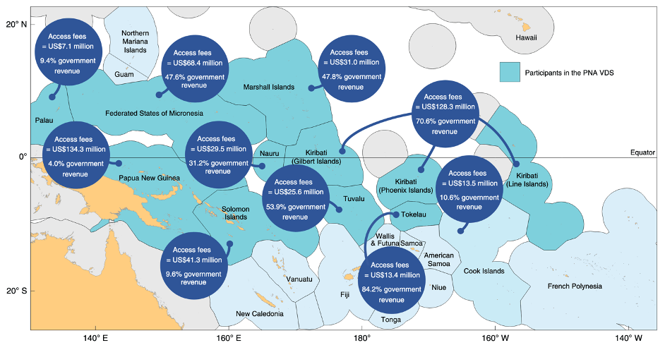 Oceania is home to the world’s largest tuna fishery, which plays a vital role in the economic development, future prosperity, and food security for SIDS. Access fees paid by commercial fishing fleets to fish within the Exclusive Economic Zone (EEZ) of SIDS account for significant proportions of government’s total revenue. At the low end, access fees make up 4% of Papua New Guinea’s GDP at USD $134.3 million. At the top end of the more “tuna dependent” states like Tokelau, access fees make up 84% of total government revenue at only USD $13.4 million.